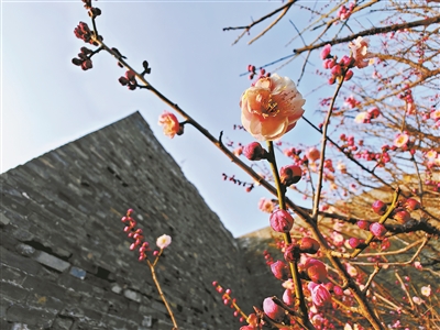 北京明城墙遗址公园的梅花热情绽放,满含蓬勃生机。