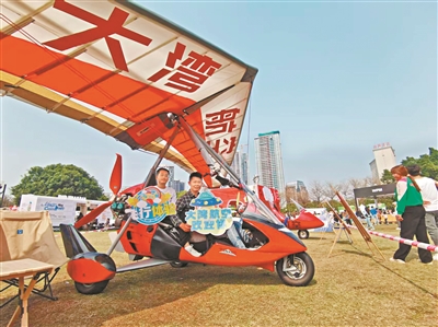 家住南城的陈女士,特意带女儿佳佳来到了大湾航空飞行营地的展位现场。当见到了三角翼、自转旋翼机、固定翼飞机等先进的飞行器时,佳佳非常开心。佳佳兴奋地问:“妈妈,什么时候你可以驾驶飞机,要带我一起飞上天!”