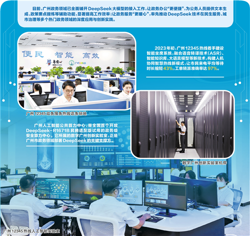 今年1月,广州完成全国首个政务领域的DeepSeek国产化适配。目前,广州政务领域已全面铺开DeepSeek大模型的接入工作,率先推动DeepSeek技术在民生服务、城市治理等多个热门政务领域的深度应用与创新实践。