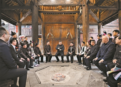 习近平在黔东南州黎平县肇兴侗寨考察时,在信团鼓楼同村干部和村民代表围坐在火塘边,共话乡村全面振兴。 新华社发