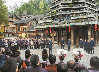 17日下午,习近平来到黔东南州黎平县肇兴侗寨考察。寨门口,身着民族盛装的村民唱起侗族大歌欢迎总书记。习近平饶有兴致地听取侗族大歌的艺术起源、曲调特点、演唱形式等方面介绍。随后,沿着村寨路道察看侗寨风貌和旅游商铺,不时驻足与店主、游客、村民互动交谈。在侗族文化展示中心,他详细了解侗族历史、风俗和服饰、建筑等特色文化保护传承情况。在侗乡特色产业基地,他观看蜡染工艺流程,对蜡染合作社坚持顾客至上、质量第一的运营理念给予肯定。习近平指出,少数民族文化是中华文化不可或缺的组成部分,既要保护有形的村落、民居、特色建筑风貌,传承无形的非物质文化遗产,又要推动其创造性转化、创新性发展,让民族特色在利用中更加鲜亮,不断焕发新的光彩。