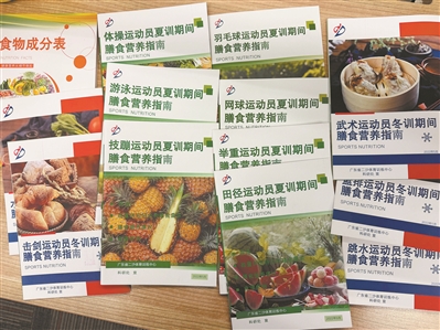广东省二沙体育训练中心科研处负责人李杰介绍,总结上一个全运周期的成功经验,科研处在2022年编撰具体到每个运动项目的《膳食营养指南》和运动员餐厅《258种食物成分表》,发放给运动员,这些指南也被摆放在运动员餐厅的显眼处,方便运动员查阅。
