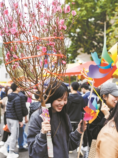 花市上,人们手拿风车寓意“时来运转”、阖家安康。