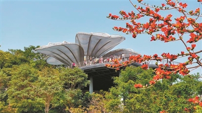 据悉,云萝植物园内木棉道长达1.5公里,是广州市内唯一穿行于白云山林冠间的空中游览步道。木棉道以市花“木棉”为设计元素,从木棉的幼苗、发芽、开花到结果,演绎了木棉的一生。沿路可以看到有11朵“木棉花”,2个棉荚亭以及1个年轮印记。木棉道是一个木棉科专类园,是木棉科植物景观示范点,也是科研人员10多年收集保育的木棉科植物资源保育圃。沿木棉道收集保育了木棉科植物12种、200多株,其中木棉树有124株。木棉树属于高大乔木,大多数时候,人们观赏枝头木棉花需要仰望。而漫步木棉道,则可以多角度与木棉树近距离接触,收获立体丰富的游览体验。