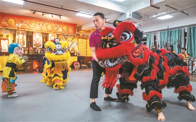 在训练场上,中华传统文化基金会非遗代表性项目主任李伟杰正指导陈正衡等少年练习舞狮动作。3年前,他独立开班授徒,如今已带领三四十名学生投身这项传统技艺传承。