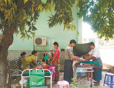 在缅甸首都内比都的千床医院,地震伤员在树下的临时病床上接受治疗。