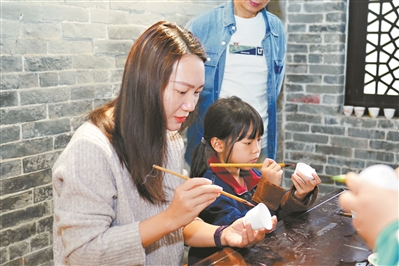 家长和孩子一起在素坯瓷器上勾勒属于自己的“作品”。