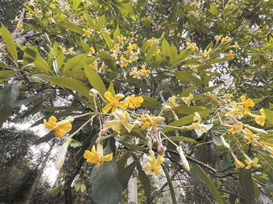 广州日报讯 (全媒体记者黄岚 通讯员许明英、高泽正摄影报道)近日,华南国家植物园澳洲园入口处的黄花香荫树迎来盛花期,金黄色的花朵缀满枝头,散发着清新的芳香。