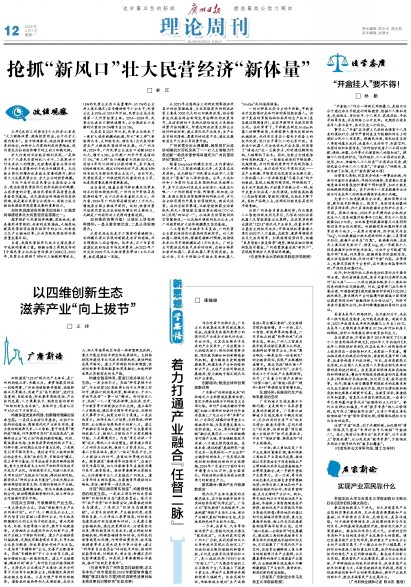 作为改革开放排头兵,广东正以系统集成改革突破发展天花板,在建设更具国际竞争力的现代化产业体系方面先行先试、作出示范。尤其在这场关乎未来的产业变革中,广东应聚焦三大战略突破口:强化创新策源功能、深化数实融合和创新跨域协同机制。着力锻造先进制造钢筋铁骨,构建未来产业和战略性新兴产业、支柱产业协同联动发展格局,努力挺起中国式现代化的产业脊梁。