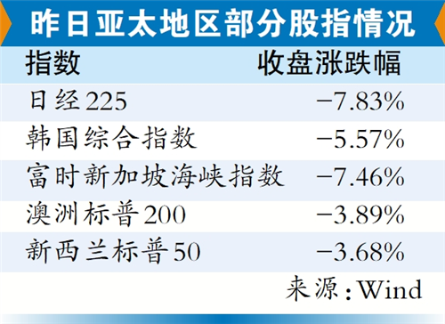 4月7日,亚太主要股指收盘全线大跌。日经225指数跌7.83%,韩国综合指数跌5.57%,澳洲标普200指数跌3.89%,新西兰标普50指数跌3.68%。欧洲主要股指大幅低开,欧洲斯托克50指数开盘跌超6%,德国DAX指数跌超7%,英国富时100指数跌超4%,法国CAC40指数跌超2%。