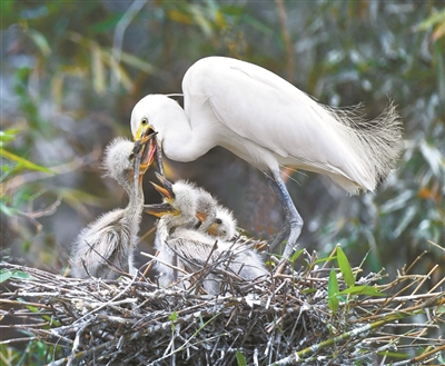 每年4月,以白鹭、夜鹭、池鹭为主的鹭鸟群进入繁殖鼎盛期。空中,鸟儿来回穿梭;林中,鸟儿忙于筑巢;巢里,鸟儿孵蛋期待着新生命的诞生。据介绍,鹭鸟产卵期约为一周,一般一窝有2至6枚蛋。经过鹭鸟“夫妻”的轮流孵化,20多天后就有小鸟出壳,整个孵化期约为一个月,现在正是今年首批鹭鸟“宝宝”出生潮。
