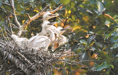 记者近距离发现,鸟巢里的许多小鸟已经“破壳”而出,刚刚孵化出来的雏鸟睁着好奇的大眼睛,从枝叶间探出头,张开小嘴,等待哺食。它们的父母守候在旁边,母亲与小候鸟嬉戏;父亲展翅高飞,沿着河边把小鱼小虾带回鸟巢,然而由母亲喂食,场面灵动和谐。