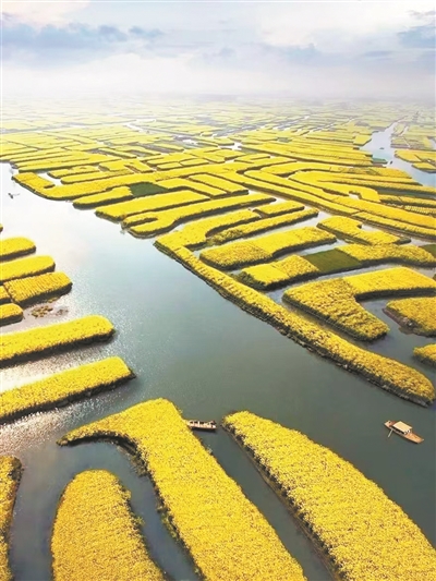 和篁岭的梯田油菜花不同,江苏省兴化市千垛镇的千垛景区则是人工垛田与自然河网的融合。兴化千垛油菜花是长在垛田上的,垛田呈条状 “漂浮”在水面上,如网的水系把油菜花海分割成一块块方田,金黄色小岛星罗棋布,形成了“河有万湾多碧水,田无一垛不黄花”的壮观景色。而船游“水上花海”,最为惬意。