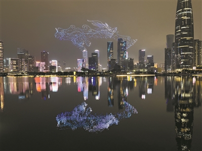 傍晚,在深圳人才公园的人才星光桥上,“甲亢哥”迎来大漠大智控提供的1500架无人机表演秀。编织出巨龙等多个形状的无人机编队在夜空中盘旋,壮观景象让他高声惊叹:“This is China!”“Amazing!”