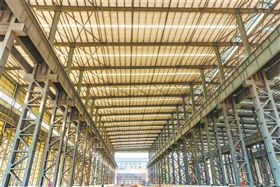 厂房的骨架由钢梁和钢柱交织而成,很有特色。