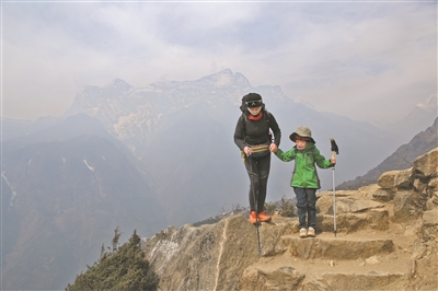 见到了珠峰的真容,严酷的挑战开始了。“到珠峰酒店这段路,风很大,土路的灰也很大,基本上走10步就要休息一下,前两天还一路讲故事的珠珠,现在也不说话了。那种我们成年人可以一步跨过去的石台阶,她的小短腿就困难重重了。”珠珠的妈妈晶晶说,她就跟珠珠定小目标,“看,前面有一块漂亮的石头,我们走到那里就休息。”珠珠也非常配合,即使很累了走不动要蹲下休息一会儿,也安慰父母,“过一会儿就好。”好不容易到了第三天的目的地珠峰酒店,办理入住时,珠珠就趴在前台睡着了。