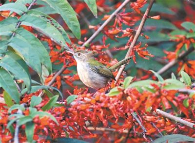 广州日报讯 (全媒体记者黄岚 通讯员李文艳、廖利芳、潘华焰、杨志红摄影报道)近日,在华南国家植物园,一片片鲜红的虾子花悄然绽放,吸引了众多鸟儿前来觅食,形成了一道独特的生态景观,引得鸟友们纷纷“守株拍鸟”。