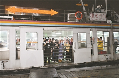 昨日21时50分,从深井码头开出的航班在夜色中伴着声声水浪向岸边靠近。岸上的乘客拿起手机拍下水巴靠岸时刻。船上乘客陆续走出,与在新洲码头的乘客挥手致意,其中部分人又再次刷卡上船,搭乘最后一趟航班。