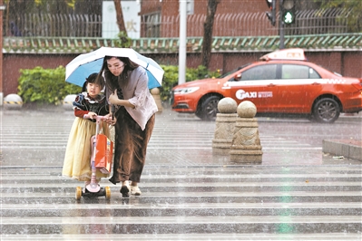 昨日,广州迎来强对流天气,在海珠区新港西路,一位女性持伞俯身护着孩子前行。广州日报全媒体记者陈忧子 摄