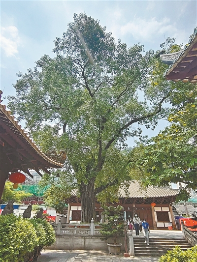 到了宋代,“光孝菩提”被列为“羊城古八景”之一。如今,六祖殿前,菩提榕生机勃勃,树影婆娑。需要指出的是,今日光孝寺的菩提榕并非千年前的首棵菩提榕。这里另有故事。清嘉庆年间,智药三藏手植的菩提榕被大风刮倒,抢救无效。寺僧从南华寺取菩提榕枝条植于光孝寺。两地菩提榕本出一脉,南华寺的菩提榕是早期从智药三藏手植的菩提榕上取枝条种植而成的,系“子枝”;如此,今日光孝寺的菩提榕可谓是“孙枝”。