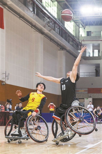在轮椅篮球赛上,广州各区的运动员一边操纵轮椅高速前进、后退、旋转,一边灵活快速运球、投球,令人目不暇接,偶尔跌倒也能立即反应,纵身还原坐姿,展示了力量与激情;在乒乓球比赛区,一字排开的乒乓球台上,不同年龄段的选手认真对决,坐着轮椅的、手臂不方便的、听力有障碍的,所有的状态都不能影响他们在飞舞的球拍和白色小球之间笑着、喊着,挥洒自己的热情。