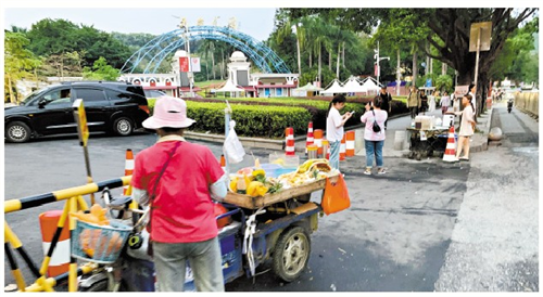 广州日报讯 (全媒体记者全杰摄影报道)云台花园是市民游客的休闲游玩胜地。但有市民游客反映,云台花园外围路段常有占道摆卖,影响市容环境卫生和城市形象。
