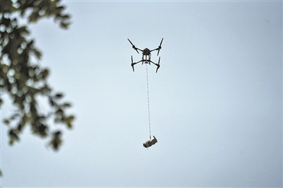 而在同古村文化广场前,伴随着螺旋桨的嗡嗡声,操作员娴熟地操控着遥控器,无人机按照预设航线精准起飞、悬停、搬运和降落,快速掠过一片片山林,不一会,一大袋剥好并捆装好的桂皮便稳稳降落在平地上。