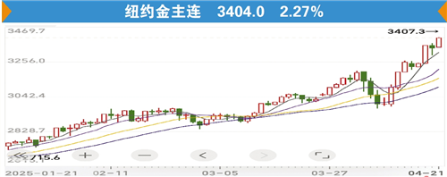 从市场走势看,4月21日上午,COMEX黄金期货盘中触及3397美元/盎司,再度刷新历史新高,上期所黄金期货主力合约涨破800元/克,今年以来累计涨幅近30%。同日,足金饰品标价周生生达1034元/克、周大福攀升至1039元/克。