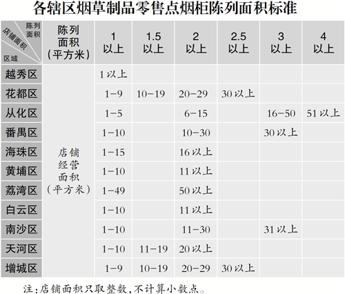 第十条 结合各辖区实际情况,烟草制品零售点经营场所应设置烟柜作为陈列面积,卷烟陈列面积要求如下: