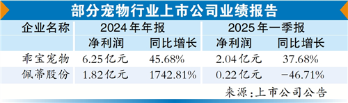 宠物经济的火爆,也直接反映到了上市公司的业绩报告中。近日,多家宠物经济相关的上市公司业绩陆续“报喜”,营业收入和净利润实现双增长。乖宝宠物去年归母净利润同比增长45.68%;2025年一季度归母净利润同比增长37.68%。佩蒂股份2024年归母净利润1.82亿元,同比增长1742.81%。