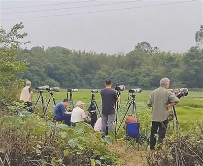 在发现彩鹮的湿地周边,这些日子每天都有来自各地的摄影爱好者聚集,静静等候彩鹮现身,多的时候有200多人。狭窄的乡村小路上,“长枪短炮”密密麻麻架起,身穿各式摄影服饰的男男女女翘首以盼,一眼望去颇为壮观,这新奇的景象让村民们大开眼界。为了捕捉彩鹮清晨的灵动姿态,有人凌晨4点就从广州出发,驱车百公里赶来,只为不错过最佳拍摄时机。一旦鸟群飞落,现场响起一片的“咔咔咔”快门声,疯狂记录下彩鹮的灵动瞬间。