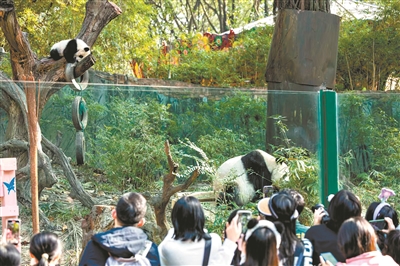 大熊猫吸引不少游客在广州进行欢乐亲子游。