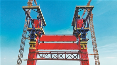 为此,项目团队自主研发了“多功能自爬式钢塔提升机”,能够同时满足整体自爬升、变截面调整、钢塔节段高精度安装、钢横梁整体同步提升、钢箱梁安装等功能,实现“塔梁一体化安装”,被形象地称为“变形金刚”。