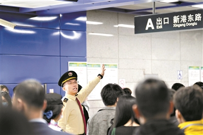 地铁工作人员疏导客流。 广州日报全媒体记者骆昌威 通讯员袁彦昌、欧兆豪 摄