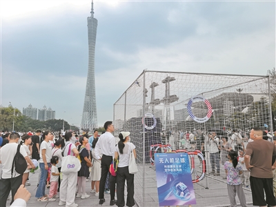 无人机足球“空中对决”吸引了不少小朋友。广州日报全媒体记者丁雄、何颖思 通讯员穗工信宣 摄