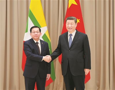 习近平指出,中缅是同甘共苦、守望相助的命运共同体。中缅两国共同倡导的和平共处五项原则和万隆精神历久弥坚,时代价值不断凸显。今年是两国建交75周年,中方将秉持睦邻、安邻、富邻、亲诚惠容、命运与共的理念方针,同缅方深化命运共同体建设,高质量共建“一带一路”,落实好全球发展倡议、全球安全倡议、全球文明倡议,给两国人民带来更多福祉。前不久,缅甸曼德勒强烈地震造成重大人员伤亡和财产损失,中方最早派出救援力量,援助紧急人道主义物资,愿继续提供帮助,支持缅方重建家园。中方支持缅甸走符合本国国情的发展道路,维护主权独立、领土完整、国家稳定,稳妥推进国内政治议程。双方要深化战略合作,持续推进中缅经济走廊重点项目建设。希望缅方切实保障在缅中方人员、机构、项目安全,加力打击网赌电诈等跨境犯罪。双方要共同捍卫以联合国为核心的国际体系和以国际法为基础的国际秩序,维护发展中国家正当权益。