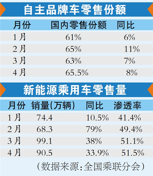 乘联会数据显示,4月自主品牌零售115万辆,同比增长31%。4月自主品牌国内零售份额为65.5%,同比增长8个百分点。1—4月自主品牌零售市场份额64%,较去年同期增长7.9个百分点。