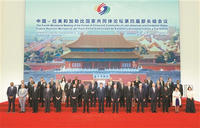 5月13日上午,国家主席习近平在北京国家会议中心出席中国-拉美和加勒比国家共同体论坛第四届部长级会议开幕式并发表主旨讲话。这是习近平同与会嘉宾集体合影。                                   新华社发
