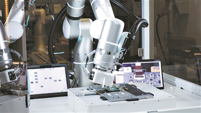 罗子健介绍:“装配的过程常常需要多个工业机器人在多个模块下共同完成。比如安装手机屏幕,前期,工业机器人要拿着物料去做清洗和检测,通过视觉检测确认符合要求后,再进行手机的装配。”