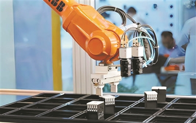 工业机器人装配可实现高精度、高效率、自动化。图为装配作业。