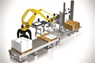 通常,物料通过输送系统到达机器人抓取位置后,机器人就可以通过视觉或其他传感器获取物料位置信息。随后,机器人通过末端执行器实现物料抓取,并将其放置到托盘上。某些托盘还可以在码垛过程中自动升降,以适应不同高度的码垛需求。码垛完成后,托盘就会被输送至下一个工序。