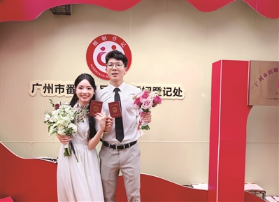 芝兰千载茂,琴瑟百年合。在新《婚姻登记条例》全面实施“全国通办”后的第一个婚姻登记高峰日,广婚姻登记机关通过提前动态增设预约量、增设窗口、延长工作时间等举措,确保每一对新人都能顺利完成登记。5月20日广州办理婚姻登记2249对,同比增加41%,其中跨省市登记约993对,婚姻登记量创历史新高。截至昨日18时,广东共办理结婚登记17418对。