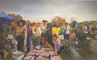作品《秋分——渔汛时节》“流淌”着浓郁的文化气韵。“在全球网络化与人工智能快速发展的今天,珠江三角洲沿海地区的渔村港口依然保留着传统的海鲜交易方式,很多人认为这才能保证最新鲜和美味的口感。其实在这背后深度链接了当地独特的生活习俗和风土人情。”创作者之一的唐志斌表示,他们在前往当地实践考察的途中被其浓郁且独特的文化深深吸引,通过在当地的实践考察收集大量素材与资料,再结合创作者自身的艺术处理创作出这件叙事性油画作品。