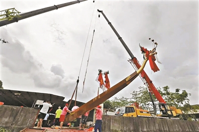 两台起重机将新龙舟缓缓吊放入东江。