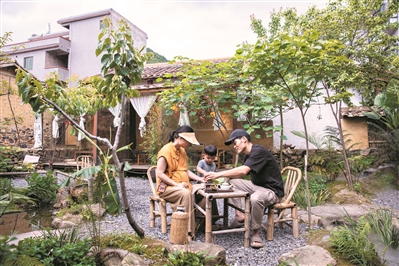 蔡驰一家三口在自家的“满院茶咖”喝茶。
