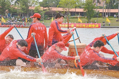 万江龙舟趁景活动,龙舟队的健儿们奋力划桨。