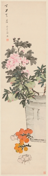 瓶花是虚谷喜画的题材之一。图中的蜜桃、枇杷、百合等是日常生活中常见的花果,给人以亲切的感觉。