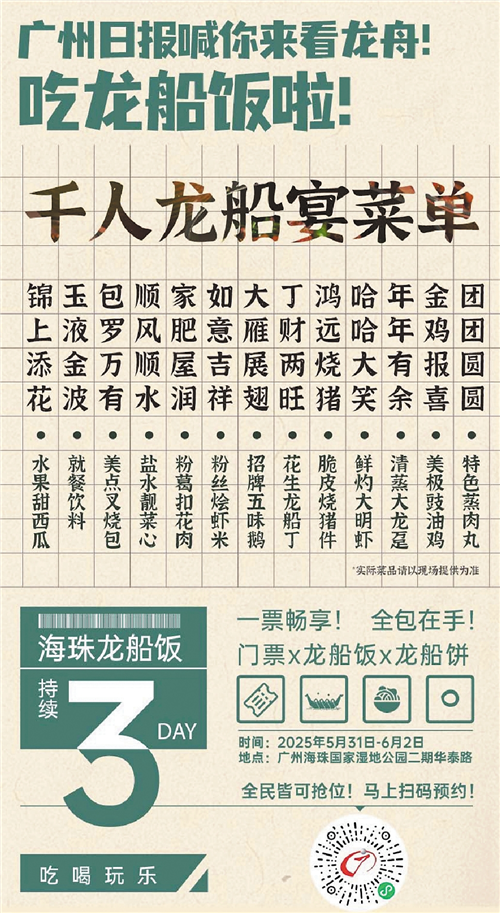 “食过龙船饭,捞乜嘢都掂(干什么都好)!”看龙舟当然要吃龙船饭,5月31日至6月2日中午和晚上,海珠湿地二期华泰路开展千人龙船宴,面向所有市民游客开放,正在火热预订中。