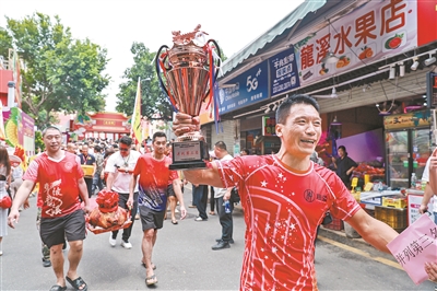 胜利了,村民手举奖杯,抬着烧猪回祠堂吃“龙船饭”。 广州日报全媒体记者苏俊杰 摄
