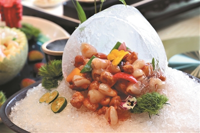 为深入挖掘和推广大朗镇荔枝文化,丰富本土美食内涵,大朗镇各大酒店食肆近日推出一系列独具匠心的荔枝特色菜品,以创新烹饪手法将传统荔枝文化与现代美食艺术完美融合,为市民和游客带来一场味觉与文化的双重盛宴。“荔枝宴”由一道道“荔枝菜”组成,创意十足,色香味俱全,令人垂涎三尺。在大朗镇制作“荔枝菜”的餐饮企业中,帝豪花园酒店是其中较具代表性的一家。该酒店行政总厨黄少荣表示,大朗的本土桂味、糯米糍等较为优质的荔枝品种一般在6月上旬上市,6月底下市。近年来,该酒店每年都会在6月推出“荔枝宴”。“荔枝宴”一般由6到12道“荔枝菜”,再加上一道汤组成,具体根据客人的人数而定。